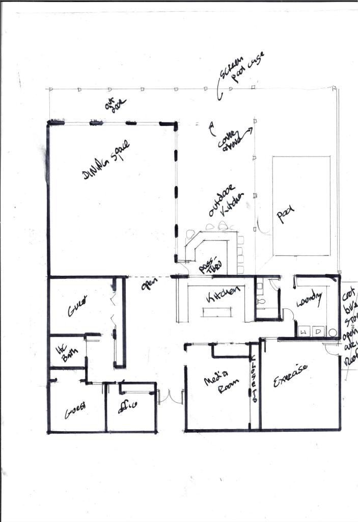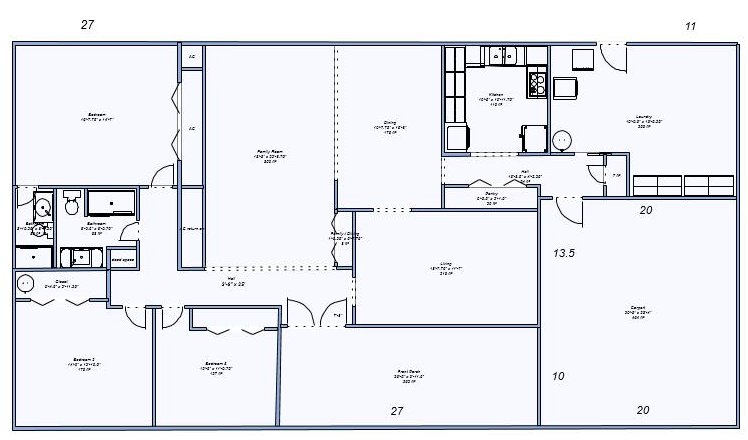 There is an existing solid block house on the property. It will need to be renovated extensively. The walls, foundation, and roof are solid. But, the electrical wiring, all windows, and plumbing will need to be modernized. Here is an approximate plan of the existing house at 11215 Davis Road: